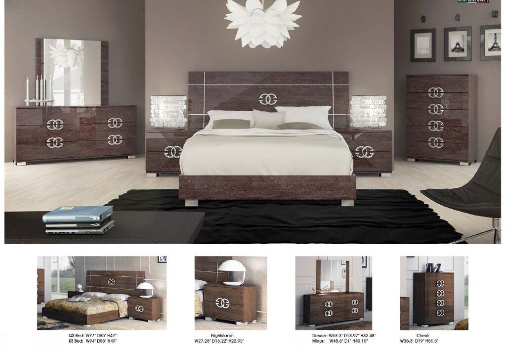 The Collection brings the modern crisp look and feels with simple satin metal brushed pulls and legs. The finish is a high gloss lacquered cognac birch finish. The set gives the space a rich, clean look and an open airy feel. The Bedroom 1038 with Sleigh Bed consists of Queen Size Bed, Nightstand, Dresser, and Mirror. The Bed is available in Queen and King Sizes.