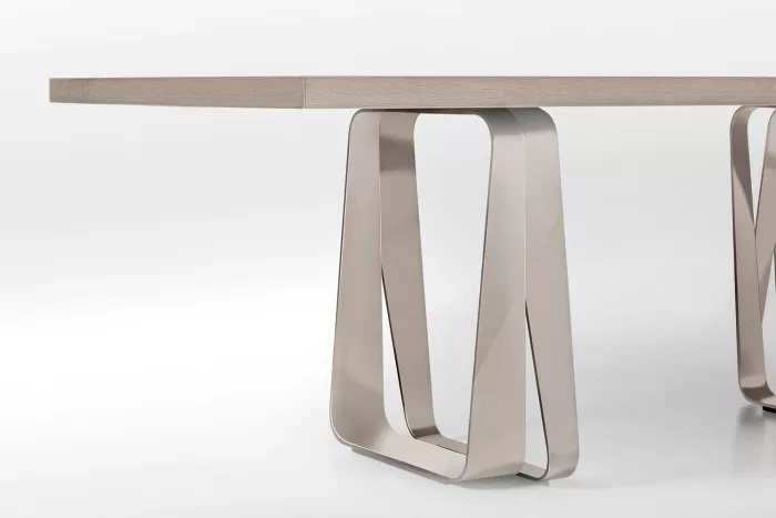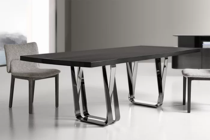 The Bend Dining Table by Costantini Pietro table epitomizes geometric and contemporary elegance with its sophisticated and innovative design. Its distinctive shapes are achieved through angled metal parallelograms. Then, by forming an interplay of bands with varying widths they support the thick wooden tabletop. In addition, the asymmetry of three legs on one side and two on the other adds movement and dynamism to the composition. Thus, it is creating a piece that exudes vibrant personality and distinctive style.