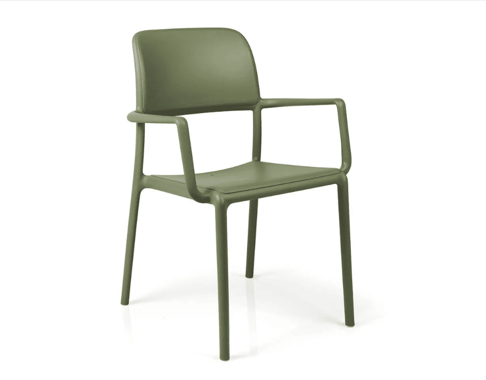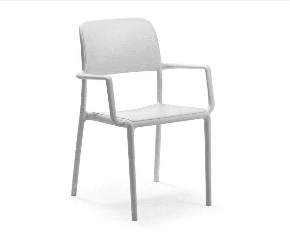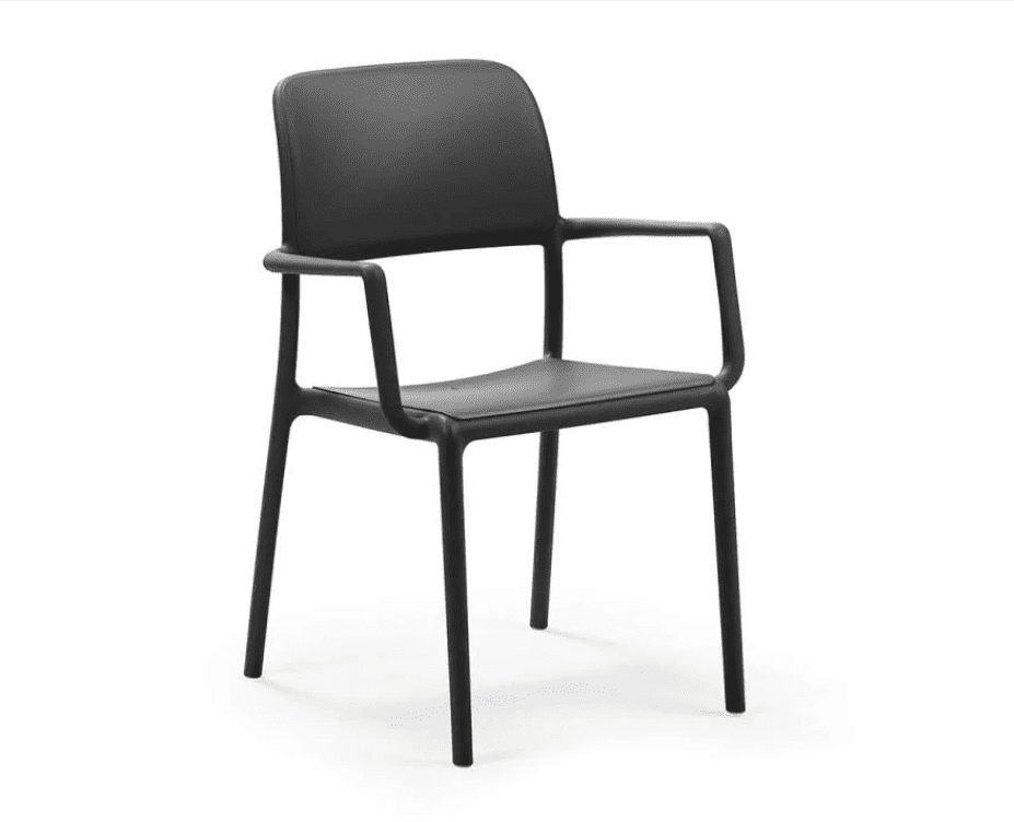 Riva is also highly practical. It features armrests for added comfort, and thanks to its stackable design, it saves space when not in use. UV additives in the resin protect it from sun damage, so the chair maintains its color and structure even when used outdoors.
