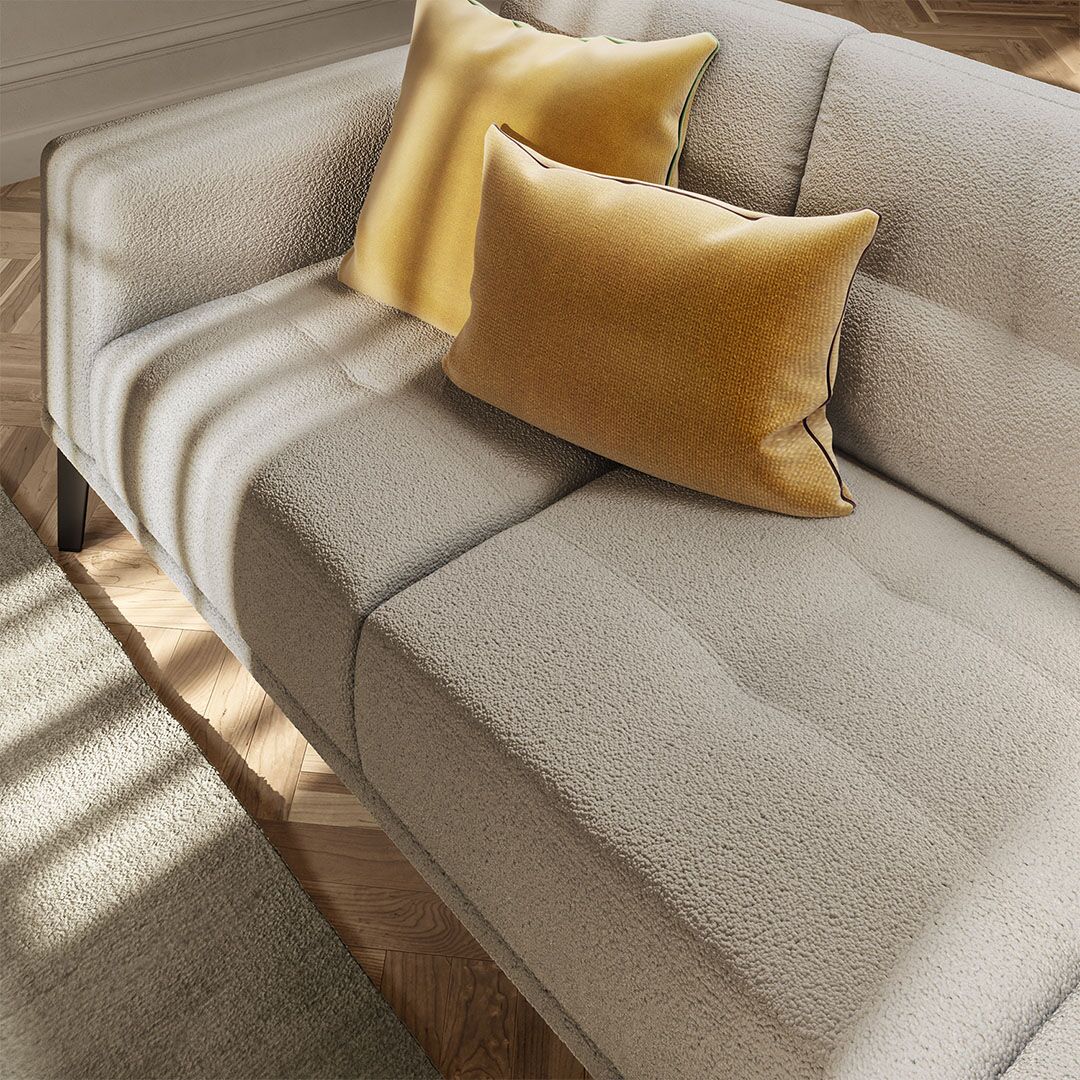 The Toledo sofa reflects Natuzzi’s signature mix of craftsmanship and comfort. Its light, geometric design is enhanced by fine tufting on the seat, backrest, and outer arm panels. These subtle details add character without overwhelming the space. As a result, the sofa fits easily into both contemporary and classic interiors, offering a warm and refined presence.