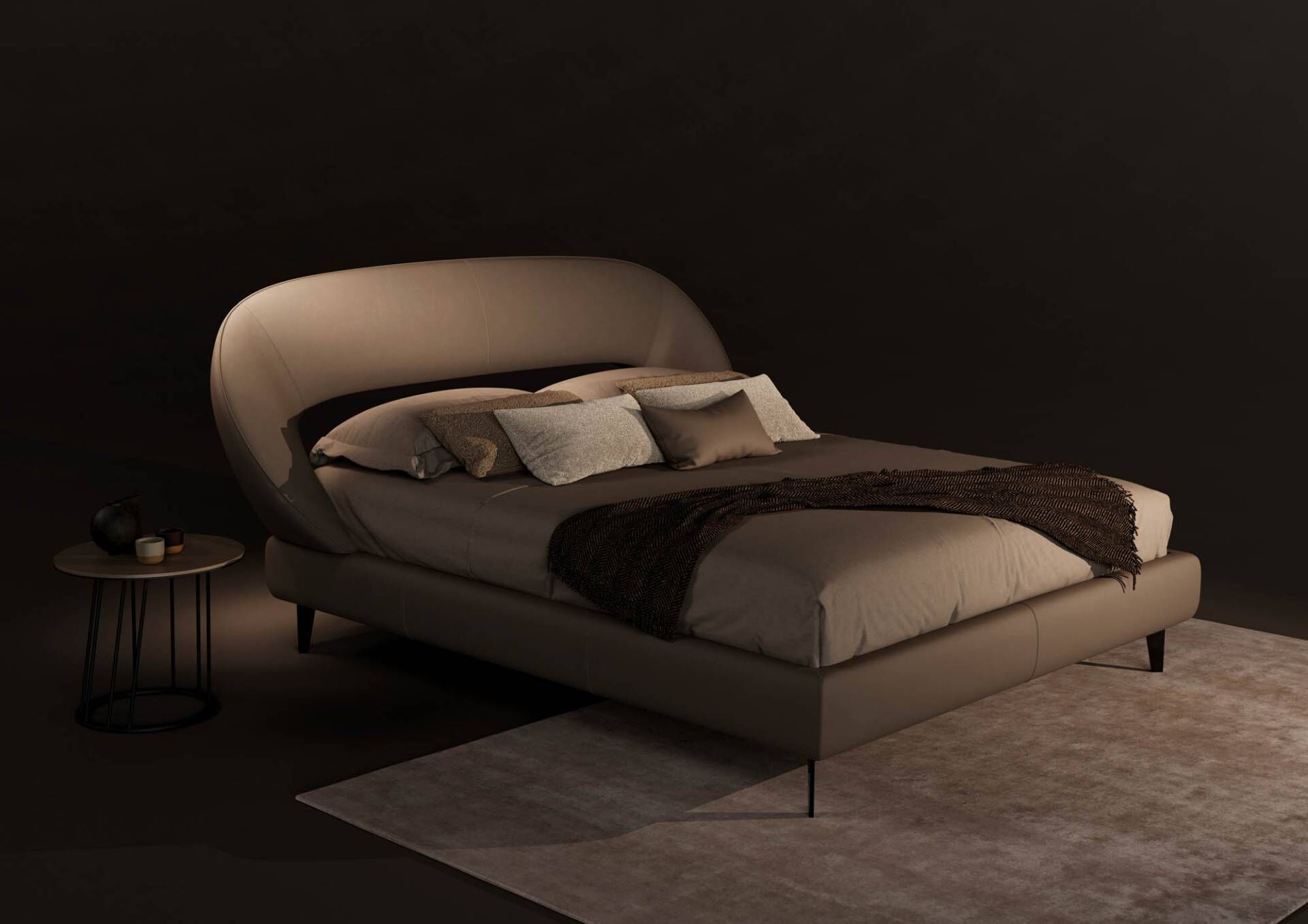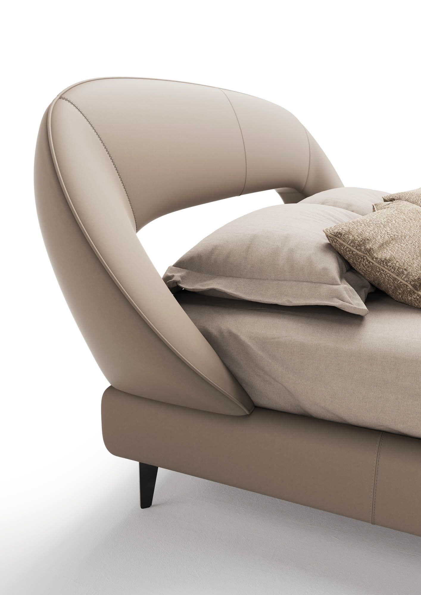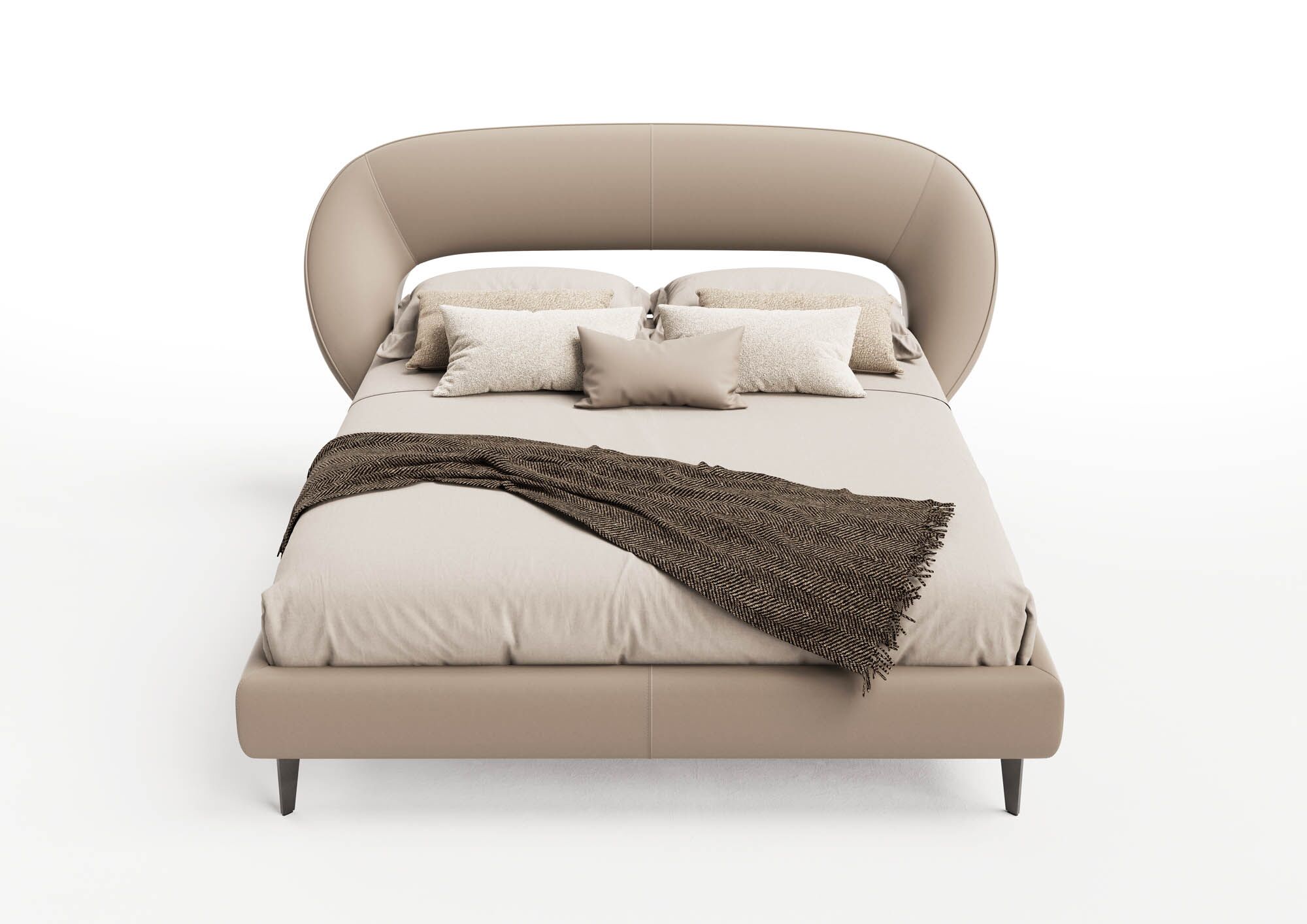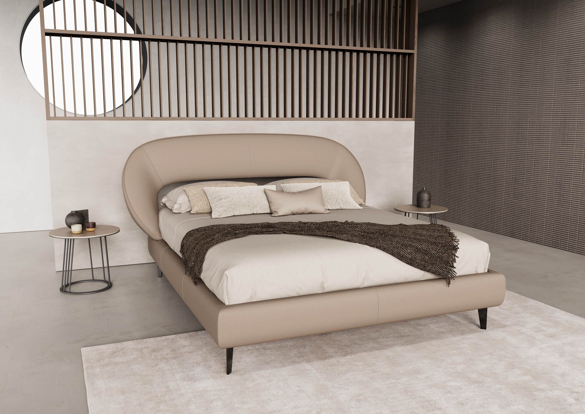The slim bed frame continues the aesthetic with smooth, rounded lines that follow a rhythmic flow. This continuity of shape and proportion brings a sense of unity between the headboard and frame, turning the entire bed into a sculpture of comfort and peace.
